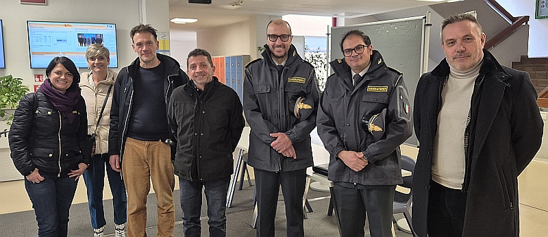 Im Bild v.l.: Direktorin des Sozialsprengels Meran, Angela Giungaio, Direktorin der italienischen Hotelfachschule C. Ritz, Ceretta Coretta, Sozialdienstmitarbeiter Daniel Anzelini, Prof. Gianluigi Di Gennaro, Leutnant der Finanzwache Meran, Beniamino Ricci, Finanzpolizist Fabrizio Candela, Vizedirektor Josef Prantl. Es fehlen: Bürgermeisterin Katharina Zeller, Kommandant der Stadtpolizei Alessandro De Paoli, die Schuldirektoren Tadeusz Sierotowicz, Armin Bauer und David Augscheller